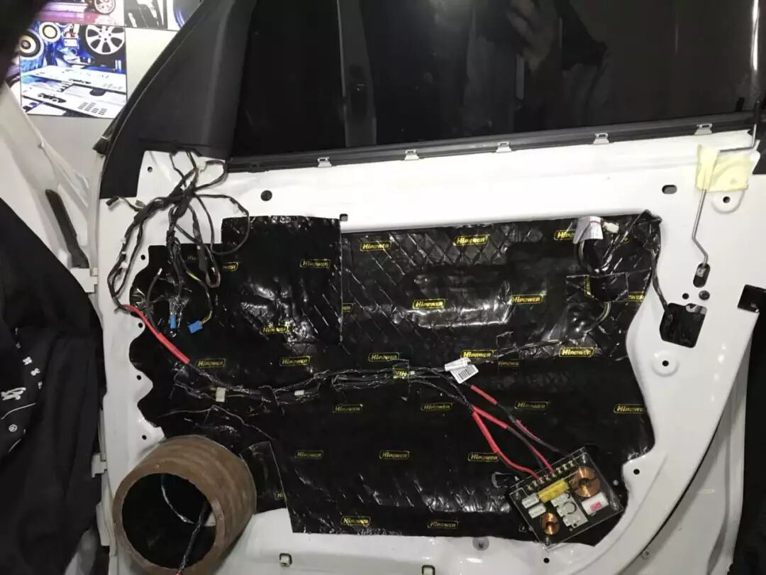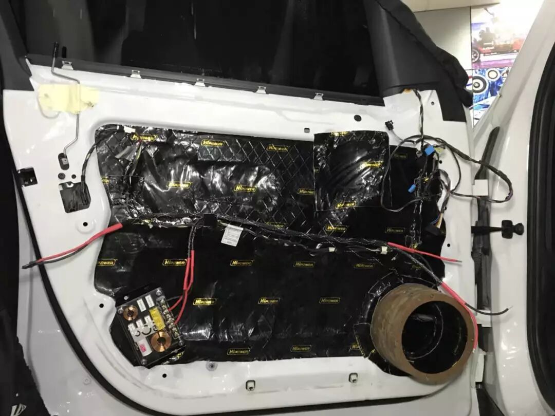 改装音响的第一步是做隔音,隔音可以通过减振材料对汽车的钣金进行减振和密封处理,改善喇叭安装环境的缺陷,还原汽车音响的音压和音质效果。 本次改装选用的是黑金隔音王,通过黑金隔音王对汽车上进行减振及隔音处理,降低汽车钣金结构传递的噪音,提高驾驶舒适度。